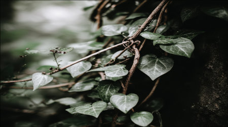 A selective focus shot of common ivy, Hedera helix, with its distinctive heart-shaped leaves. The dark, atmospheric lighting creates a mysterious and natural background.