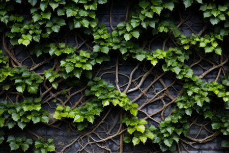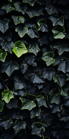 Vibrant green ivy leaves and interwoven vines cover a dark, textured wall, creating a natural backdrop