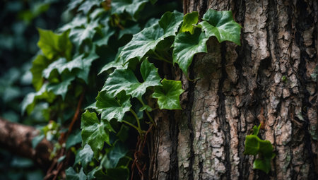 ivy branches climbing up the textured trunk of a tree