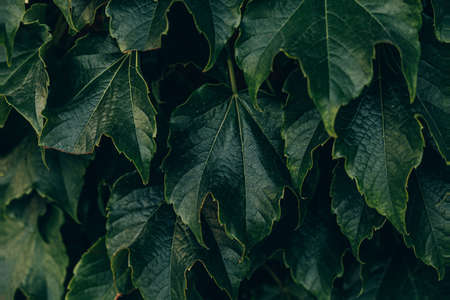 Closeup macro of Virginia creeper plant five-leaved ivy with green leaves. Toned with retro vintage filters. Textured natural green abstract background.