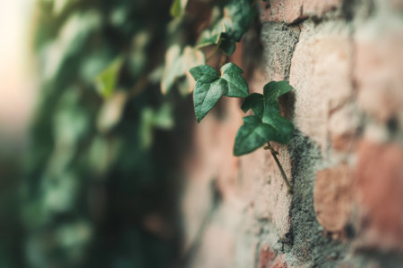 Green Ivy Leaves Climbing Brick Wall in Soft Focus Sunset Lighting.