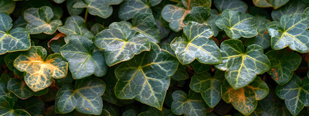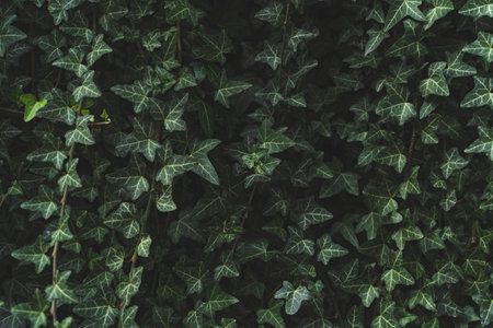 Dark nature background of detailed sharp ivy leaves with copy space – Lush garden or park vegetation of small decorative plants in dim light