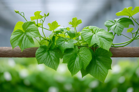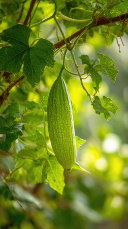 The Ridge gourd in spring, fresh green leaves, soft sunlight filtering, vibrant atmosphere full of vitality, natural textures, serene mood P.