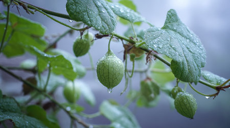 The Cucamelon in light fog, dew on leaves, light soft diffused, three-quarter view