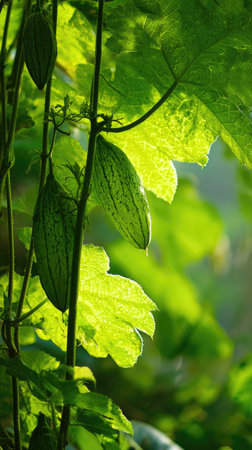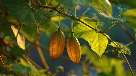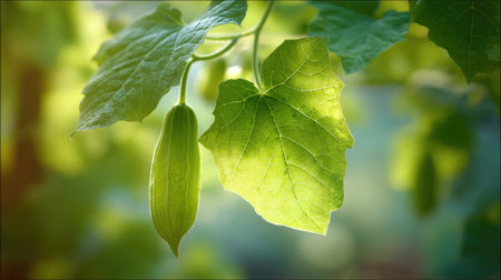 The Sponge gourd at dawn soft golden sunlight kissing leaves clean air natural color