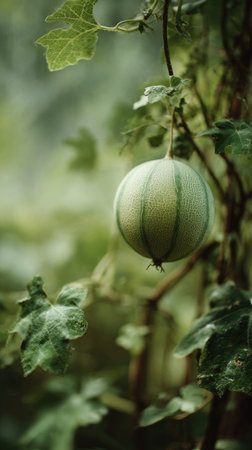 A detailed photograph of a single Galia melon, swaying gently in the wind, captured in natural daylight. Fresh and airy atmosphere, soft motion blur on leaves, crisp details on textures, background softly blurred into natural greenery, cinematic natural light, realistic photography.