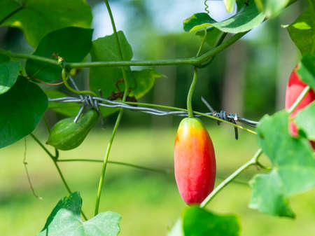 Ivy gourd (Scientific name: Coccinia grandis (L.) Voigt) Red ripe fruit hangs on vines that cling to a barbed wire fence.
