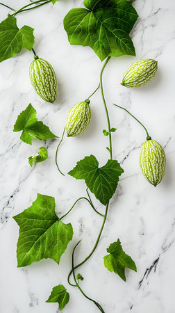 Top view displays a creative flat lay of vibrant foliage and exotic immature fruit laid on a clean, elegant marble background creating a fresh organic aesthetic.