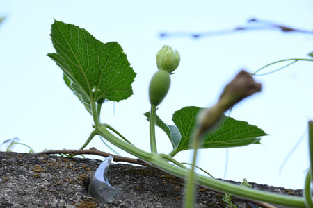 Small Bottle gourd with flowers. It is a vine grown for its fruit. Its other names Calabash, Lagenaria siceraria,  white flowered gourd, long melon, birdhouse gourd,New Guinea bean