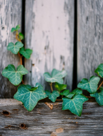 Ivy leaves gracefully spread over a weathered wooden texture, showing shades of green and the charm of untamed nature in daylight.