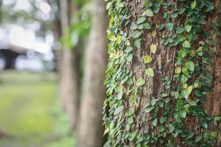 Close-up of tree trunk covered with small green creeping vines, with a blurred background of trees and greenery, creating a natural and serene forest scene.