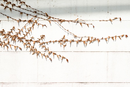 a brown plant with vines growing up a concrete wall, captured in a minimalist nature study. the photo showcases the naturalistic pose of the plant, with sunrays shining upon it, creating a visually striking effect. the ambient occlusion style and photo-realistic techniques enhance the overall aesthetic, while the loose paint application adds a touch of artistic flair. ai generated