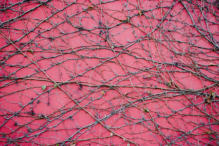 Ivy red wall texture background concept photo. Old brick wall and autumn creeper, bricks fence, retro exterior. District of European town. High quality picture for wallpaper, travel blog.