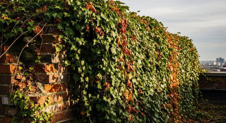 Vibrant green vines climb and cascade around a textured wall, creating a natural border in a serene outdoor space, showing the beauty of nature and plant life.