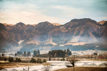 Snow covered Mount Akita Komagatake and local town along train route from Kakunodate to Morioka in Tohoku region - Japan