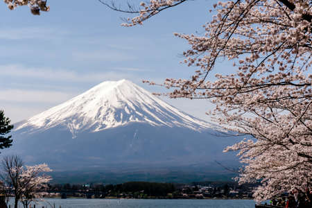 Mount fuji at Lake kawaguchiko in the morning. Sakura season in Japan.