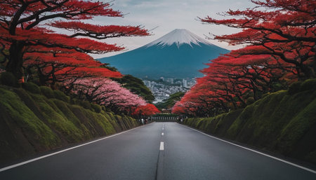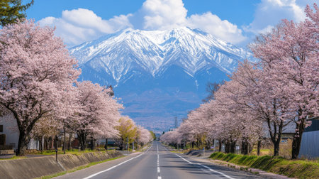 A quiet rural road lined with cherry blossom trees, leading toward a distant mountain range bathed in soft sunlight.