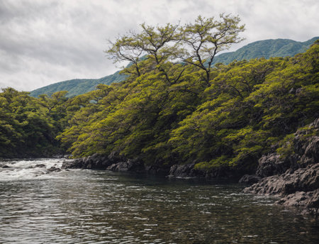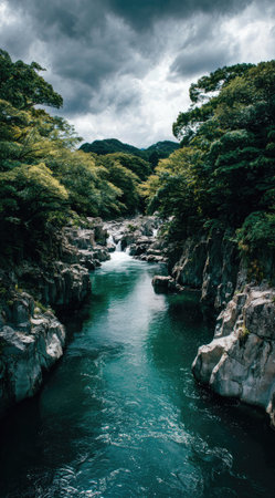 A river carves a path through a rocky gorge, flanked by dense green trees under a cloudy sky. The water reflects the surrounding environment, creating a vibrant visual contrast with the rocks. This landscape image could be suitable for various commercial or editorial applications.