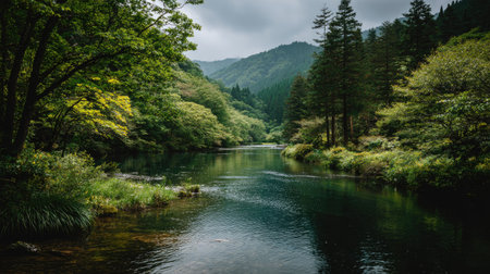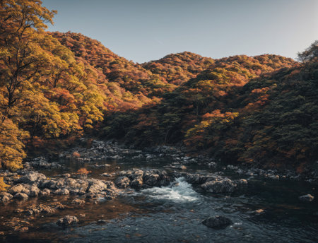 Serene Autumn Landscape With Flowing River and Colorful Foliage in the Mountains