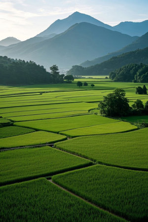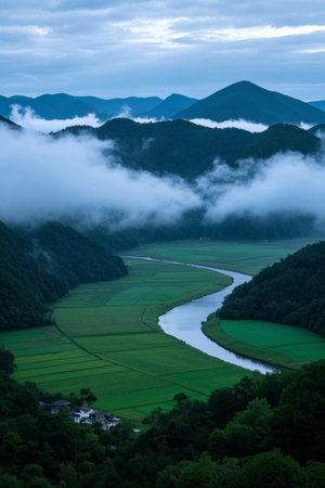 Fog over rice fields in high mountain region of Yotsuya no Semmaida. Rural summer landscape
