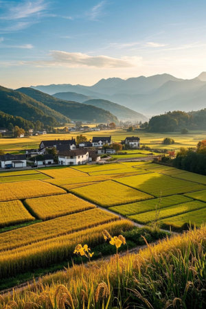 Local Japanese farm village in morning near Magome juku preserved town, Kiso valley, Nakatsugawa, Gifu, Japan. Houses and farmland against sunrise light.