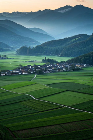 An asphalt road stretches toward a distant mountain range under an orange sunset. The foreground features cultivated fields and several buildings. The composition is a long shot, using natural light to highlight textures and colors. This image is suitable for various commercial uses, including travel, nature, or environmental themes.