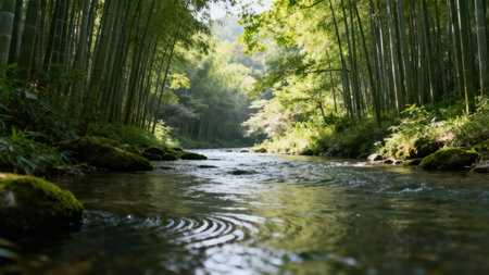 Sunlight penetrates the dense green bamboo stalks surrounding a crystal clear running creek, creating circular water ripples near the foreground moss covered shoreline.
