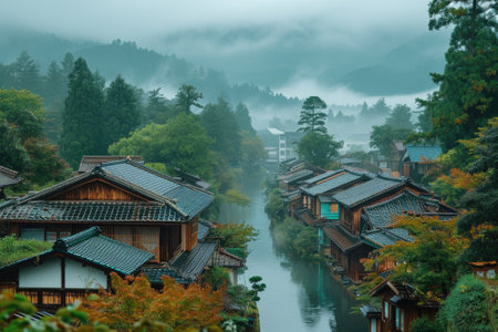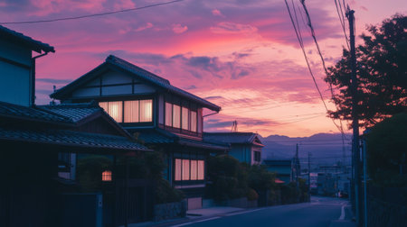 A picturesque Japanese village with traditional houses nestled amongst mountains at sunset.