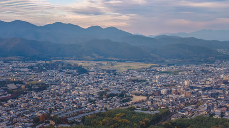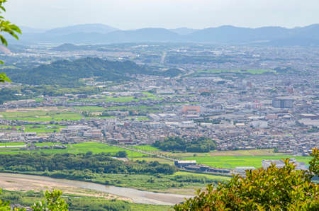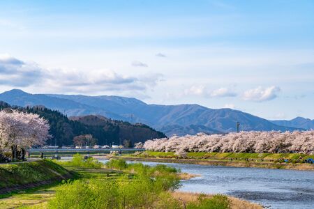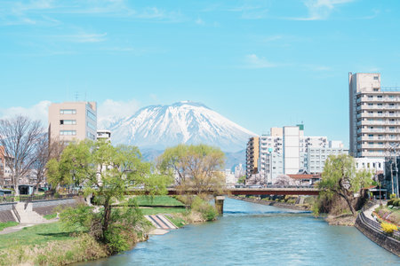 Beautiful Iwate mountain and Kitakami river with flowers blooming in Spring season, cityscape against blue sky in Morioka city, Iwate prefecture, Japan. famous Landmark Travel and Vacation destination
