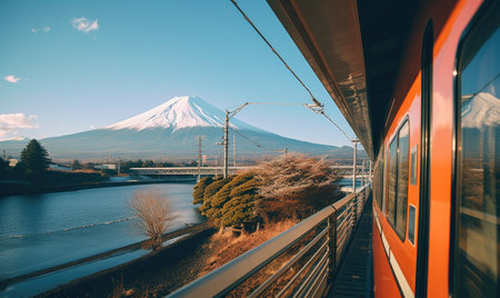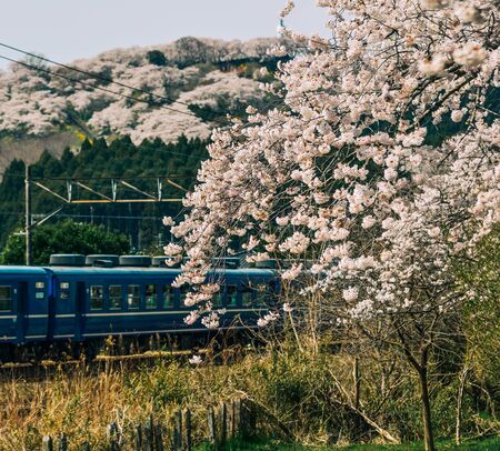Scenic view of Tohoku train with full bloom of sakura. The act of hanami (cherry blossom) is an ancient tradition that represents appreciating the fleeting nature of life.
