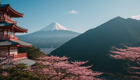 Mt. Fuji with cherry blossom and pagoda in Japan