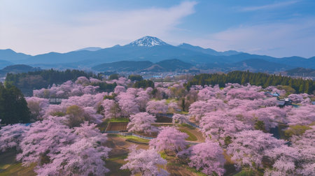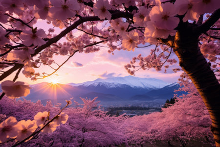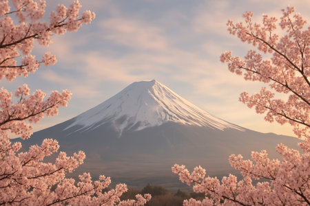 Snow-capped peak rises majestically as cherry blossom trees frame the foreground in a tranquil landscape at dawn near.