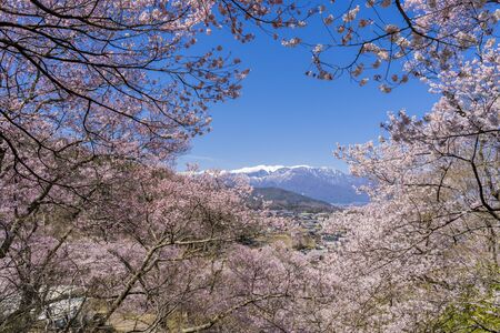 Cherry blossoms in full bloom in Takato Castle Ruins Park and the Japanese Alps