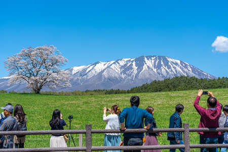 Lonesome Cherry Blossoms and snow capped Mt. Iwate in springtime clear blue sky sunny day. One lonely pink tree standing on green rural grassland. Shizukuishi, Iwate, Japan