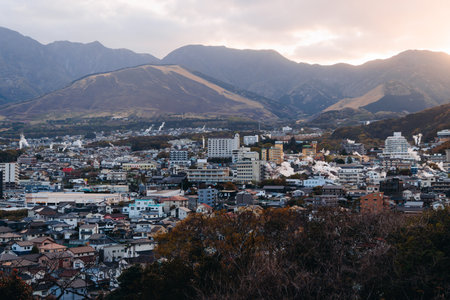 Beppu, Japan, city panorama skyline, Kannawa onsen distict, Oita prefecture, Kyushu island region,, Yukemuri observation deck, rising hot steam from onsen ryokan bath houses, Beppu resort hot springs