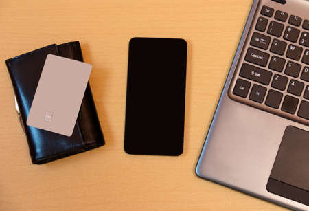 Online shopping and e-payment concept. Laptop, cellphone and credit card for online shopping on a white table. Online payment, digital banking. modern interior.