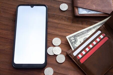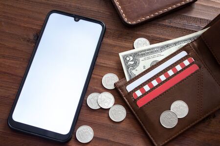 Brown leather wallet and mobile phone on wooden table. Online money concept. Mobile transfer and banking