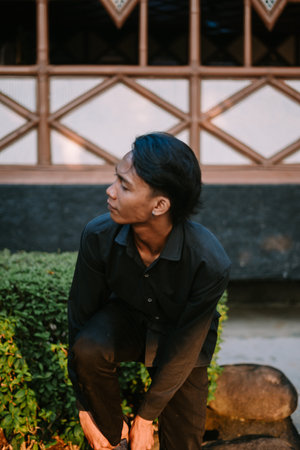 Portrait of a Southeast Asian man wearing a black shirt looking at the camera during golden hour in the afternoon with bokeh background. A vertical photo.