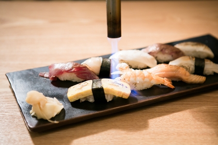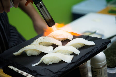 chef sushi using a torch.