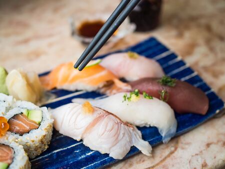Salted sushi with chopsticks in a sushi shop.Salmon Sushi.