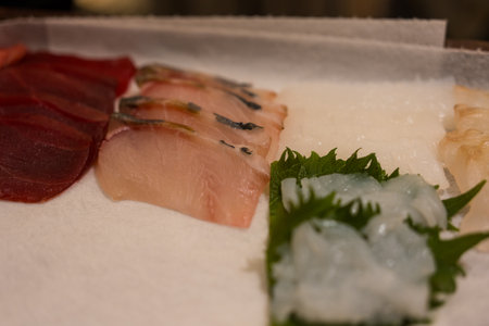 Japanese food sushi tuna with nori in the restaurant, Sashimi raw tuna menu set Japanese cuisine fresh ingredients on tray, selective focus