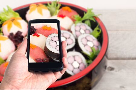 Modern mobile phone used to take pictures of nicely decorated sushi platter