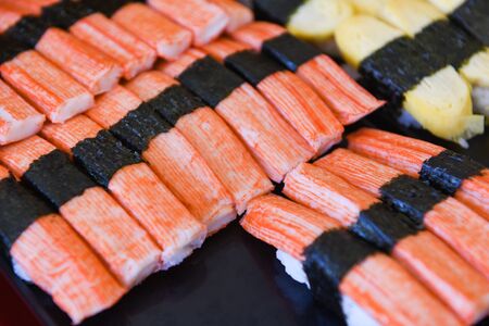 Sushi menu set Japanese cuisine fresh ingredients on tray / Japanese food sushi crab stick with nori roll in the restaurant