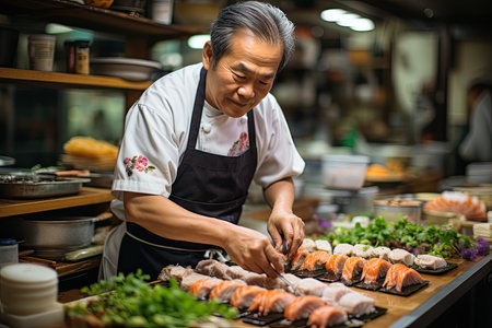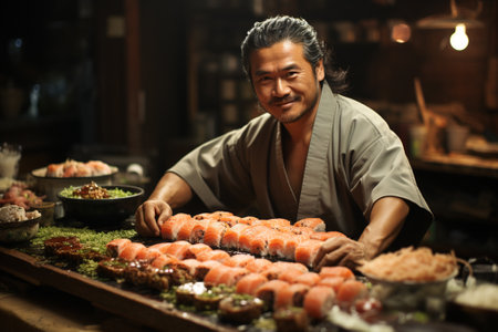 Skillful Japanese chef preparing fresh sushi, generative AI