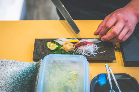 hands of chef preparing sashimi raw fish in a japanese restaurant