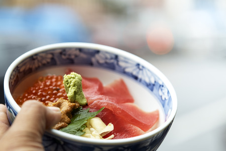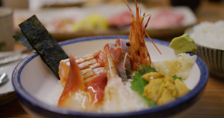 Close up shot of a bowl of fresh sashimi at Sendai, Japan