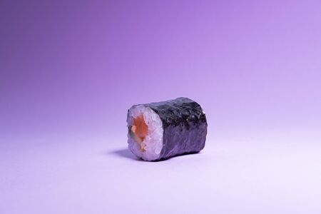 Salmon and avocado maki roll isolated on purple background. Japanese cuisine. Close up view.