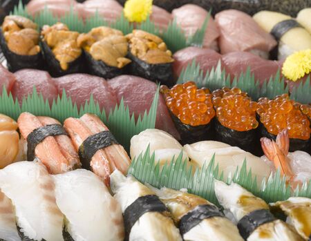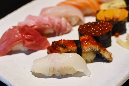 sushi japan is traditional Asian food the ingredients include rice with raw fish sweet eggs seaweed salmon uni tuna all are good and fresh, the closeup of Japan fresh national dish.