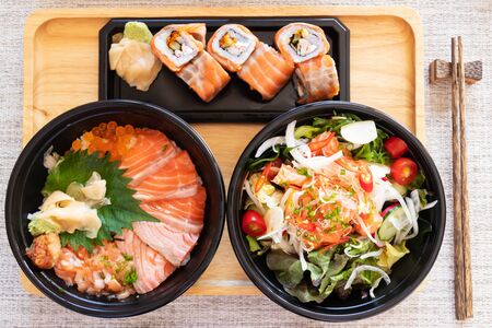 Japanese food salmon and ikura don, salmon sushi roll and spicy salmon salad with vegetables and herbs. Top view on wooden tray with chopsticks.