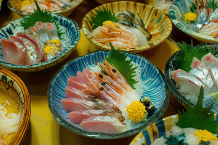 A close-up view of a variety of sashimi, including tuna, salmon, shrimp, and other fresh seafood, displayed on colorful ceramic plates. - Generative AI
